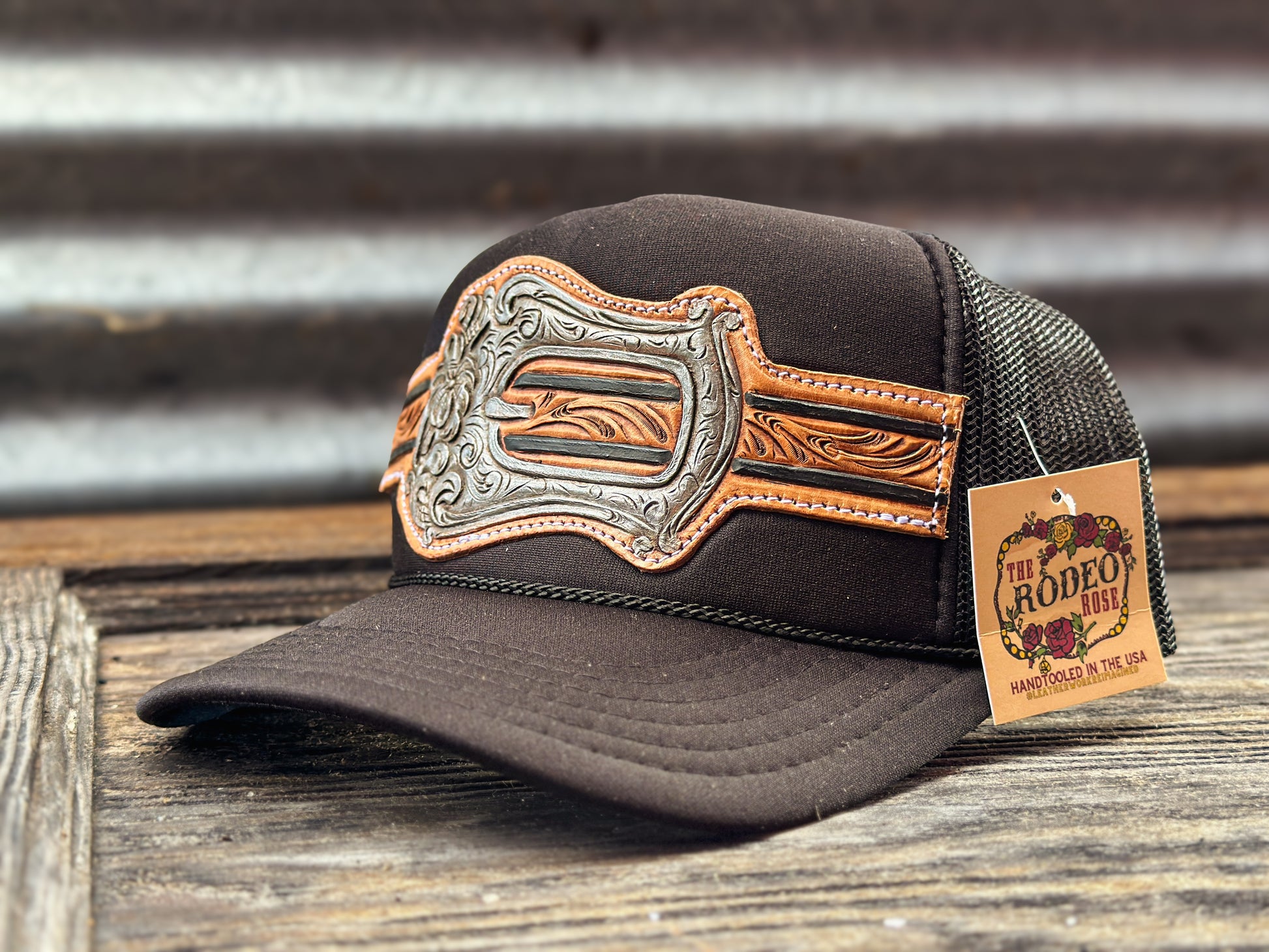 Hand Tooled- Hand Painted- Silver Buckle- Leather Patch Cap