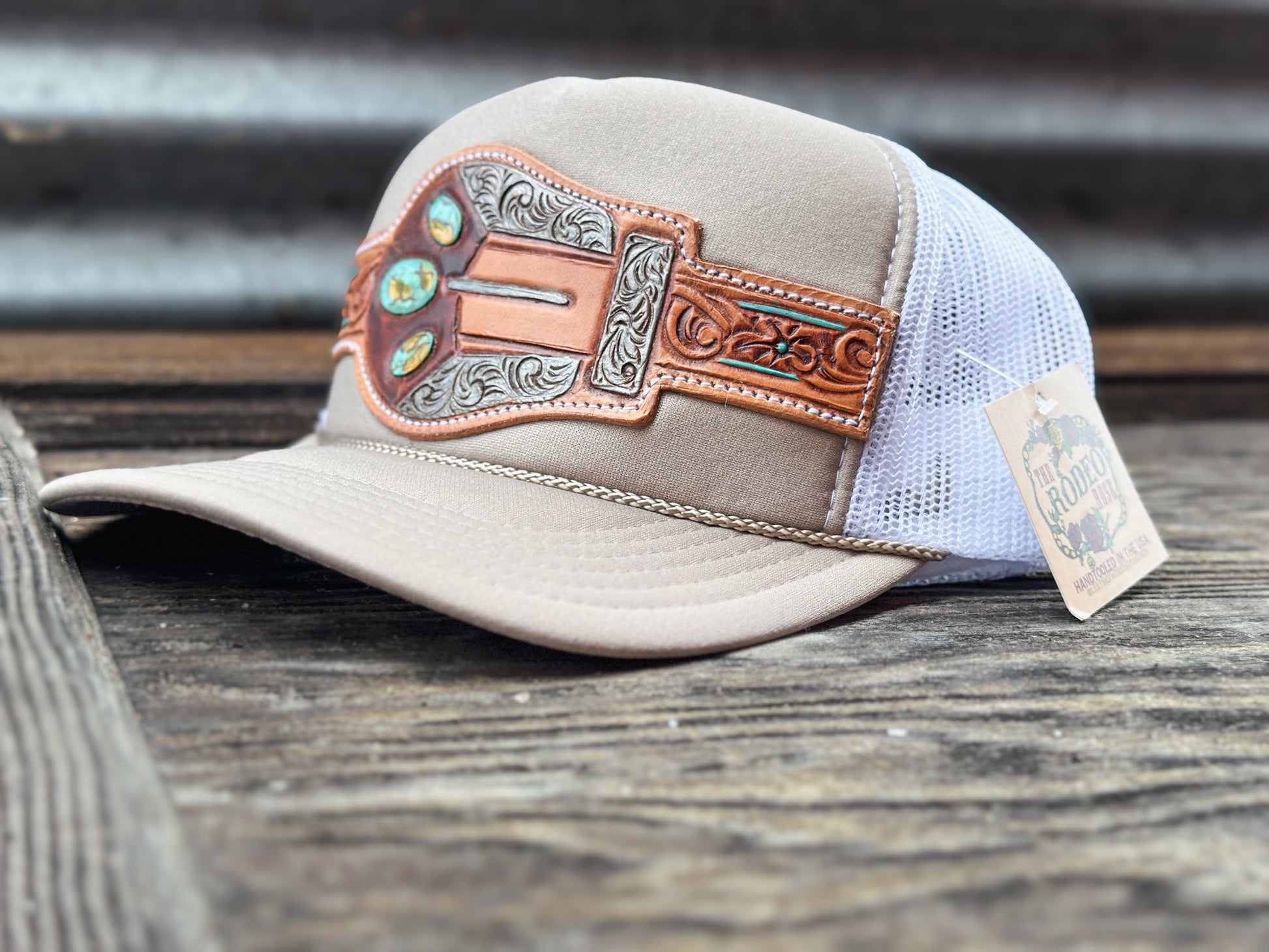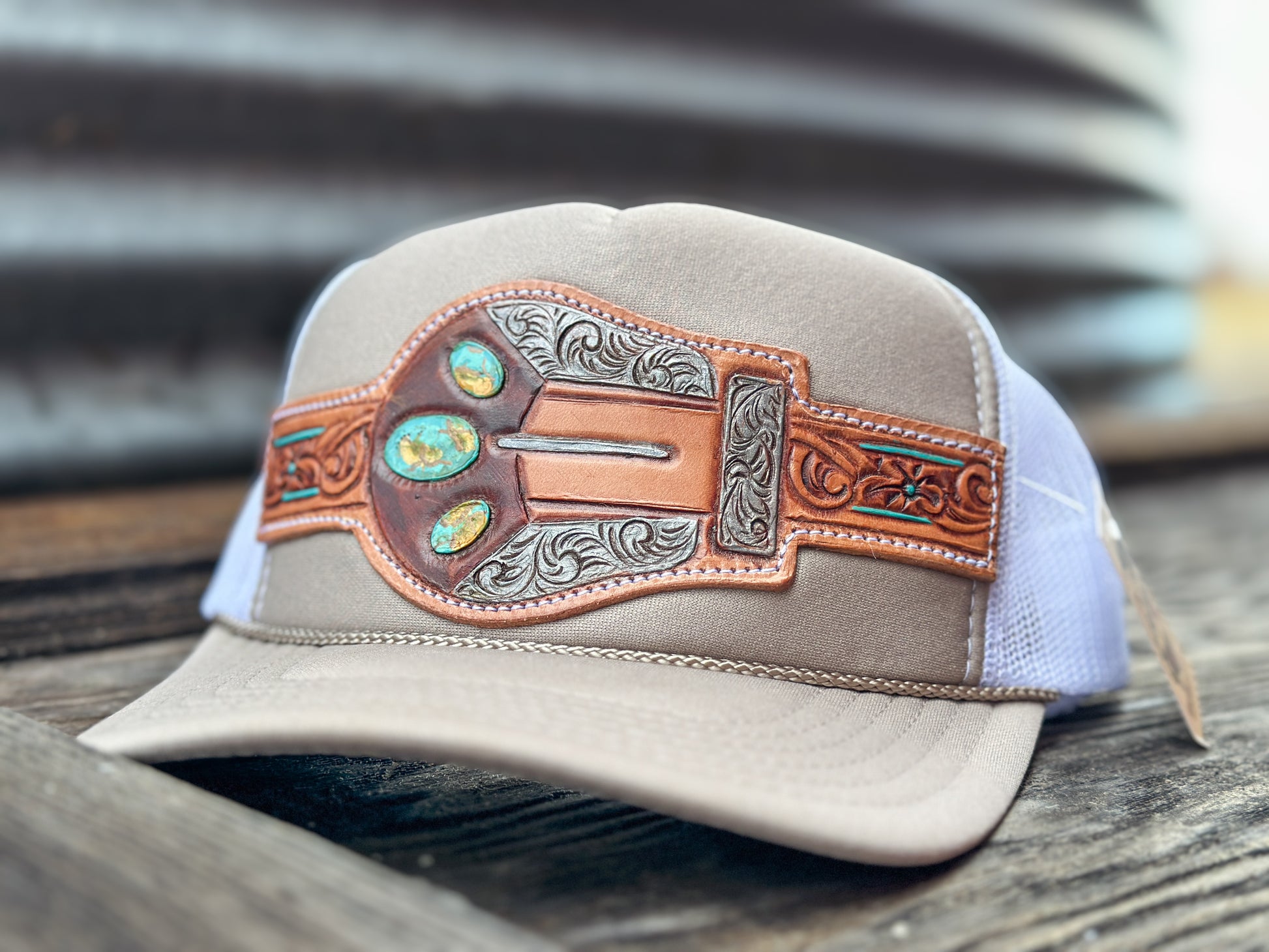 Hand Tooled- Hand Painted- Turquoise Buckle- Leather Patch Cap